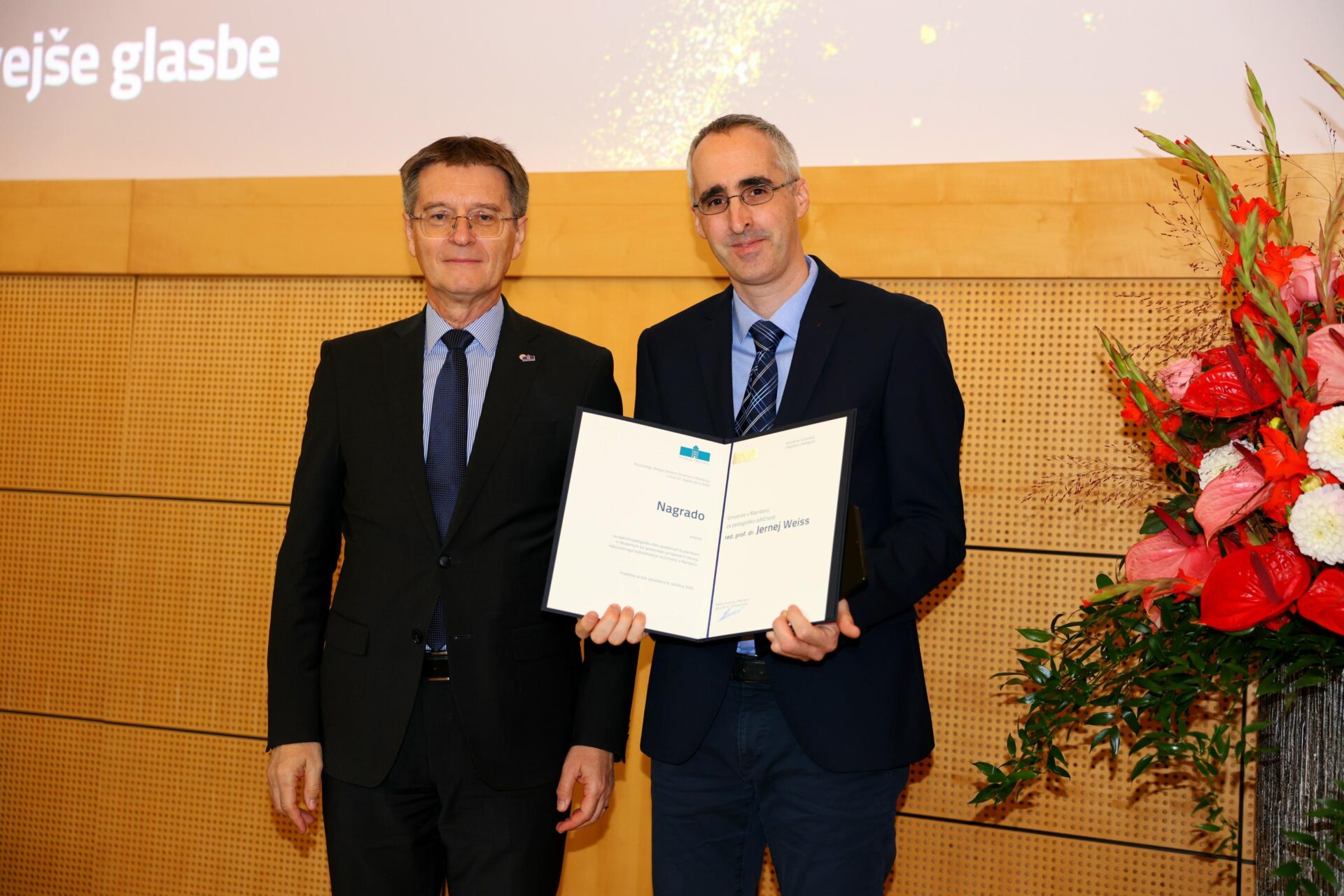 Med prejemniki je tudi red. prof. dr. Jernej Weiss (Pedagoška fakulteta UM, učna enota Zgodovina novejše glasbe), ki je nagrado prejel v kategoriji visokošolskih učiteljev in učiteljic s področja družboslovja in humanistike.