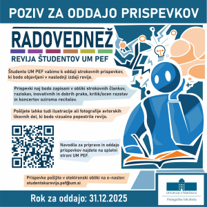 vabimo vas k oddaji prispevkov v študentski reviji Radovednež. Pripravite lahko strokovna besedila, ki se nanašajo na učinkovite pedagoške prakse, uporabo digitalne tehnologije v izobraževanju, profesionalni razvoj učiteljev in vzgojiteljev, inovacije v izobraževalnem procesu, področje posebnih potreb učencev in inkluzije, učinkovito vodenje institucij in podobno. Na področju umetnosti se prispevki lahko nanašajo na kritike razstav, koncertov in recitalov, predstavitve umetnikov in umetnin, inovacije v likovni in glasbeni pedagogiki, nove umetniške tehnologije, ipd.